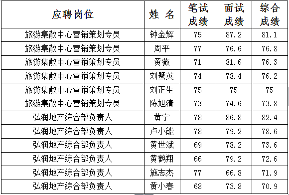 根據(jù)贛州旅游投資集團(tuán)子公司招聘公告,現(xiàn)將入圍旅游集散中心營銷策劃專員和弘潤地產(chǎn)綜合部負(fù)責(zé)人人員筆試、面試綜合成績排名公告如下: