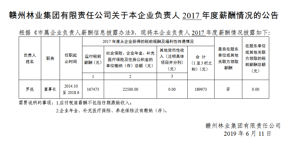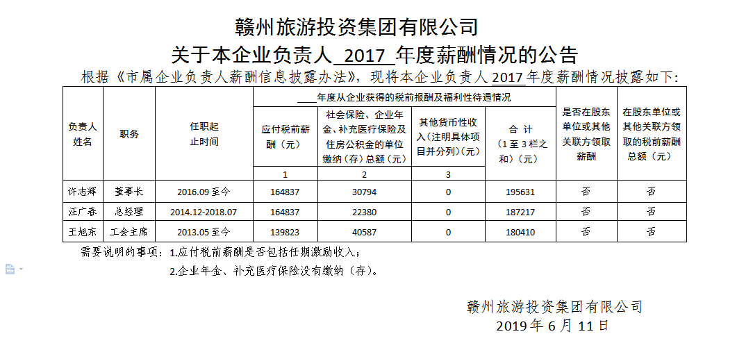 贛州旅游投資集團(tuán)有限公司關(guān)于本企業(yè)負(fù)責(zé)人及下屬企業(yè)贛州林業(yè)集團(tuán)有限責(zé)任公司負(fù)責(zé)人2017年度薪酬情況的公告