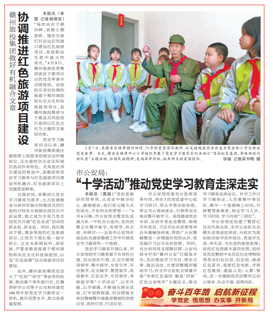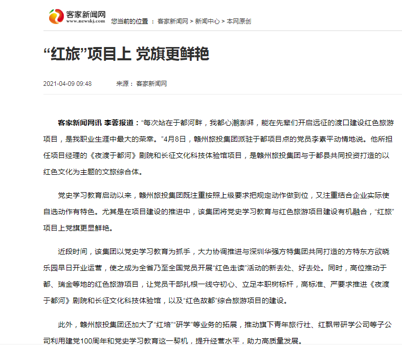 編者按:黨史學(xué)習(xí)教育啟動(dòng)以來,贛州旅投集團(tuán)按照中央、省委、市委和市國資委黨委的統(tǒng)一部署,扎實(shí)推進(jìn)相關(guān)工作,目前進(jìn)展順利、氛圍濃厚。4月9日,《贛南日?qǐng)?bào)》、客家新聞網(wǎng)等媒體集中報(bào)道了贛州旅投集團(tuán)黨史學(xué)習(xí)教育的特色亮點(diǎn),現(xiàn)予轉(zhuǎn)載。