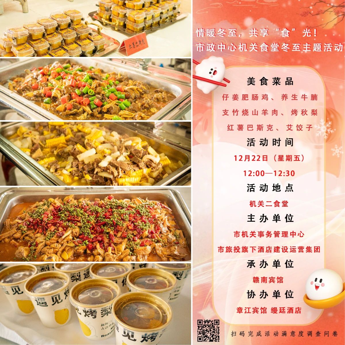 冬日暖陽,佳肴新上,活動現(xiàn)場,熱鬧非凡。酒店集團(tuán)提前籌劃、精心烹飪,在午餐時(shí)段為市政機(jī)關(guān)干職工準(zhǔn)備了六道節(jié)氣美食,讓干職工們在寒冷冬至感受到來自星級酒店大廚帶來的暖胃美食,大家紛紛表示此次活動開展的既有創(chuàng)意又非常暖心,品鑒后都為自己最鐘愛的美食進(jìn)行了投票。最終縵廷酒店代表隊(duì)《支竹燒山羊肉》和《烤秋梨》收獲最多點(diǎn)贊。